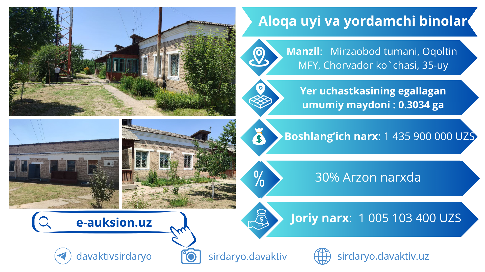 Aloqa uyi va yordamchi binolar e-auksion platformasida 60 oy muddatli to'lovga 3…