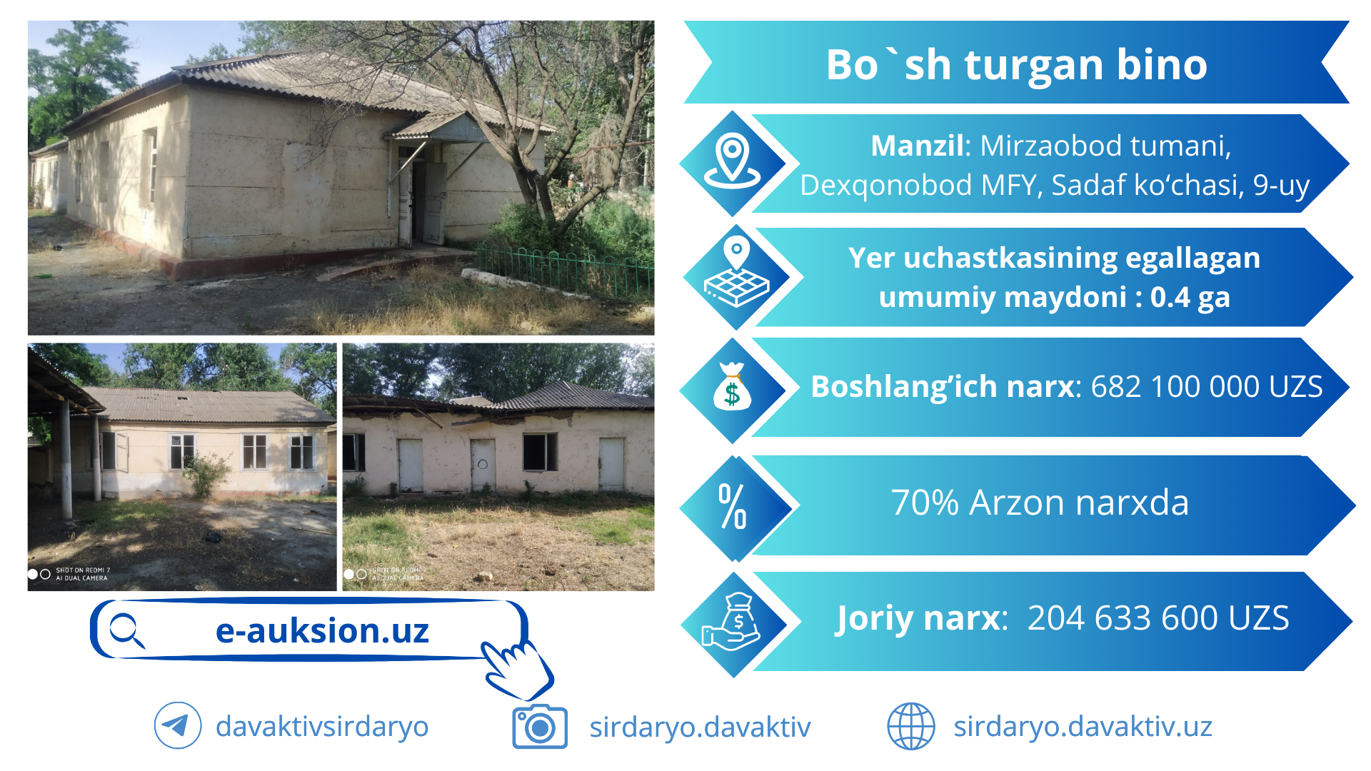 Bo'sh turgan binoni e-auksion platformasida 60 oy muddatli to'lovga 70% arzon na…