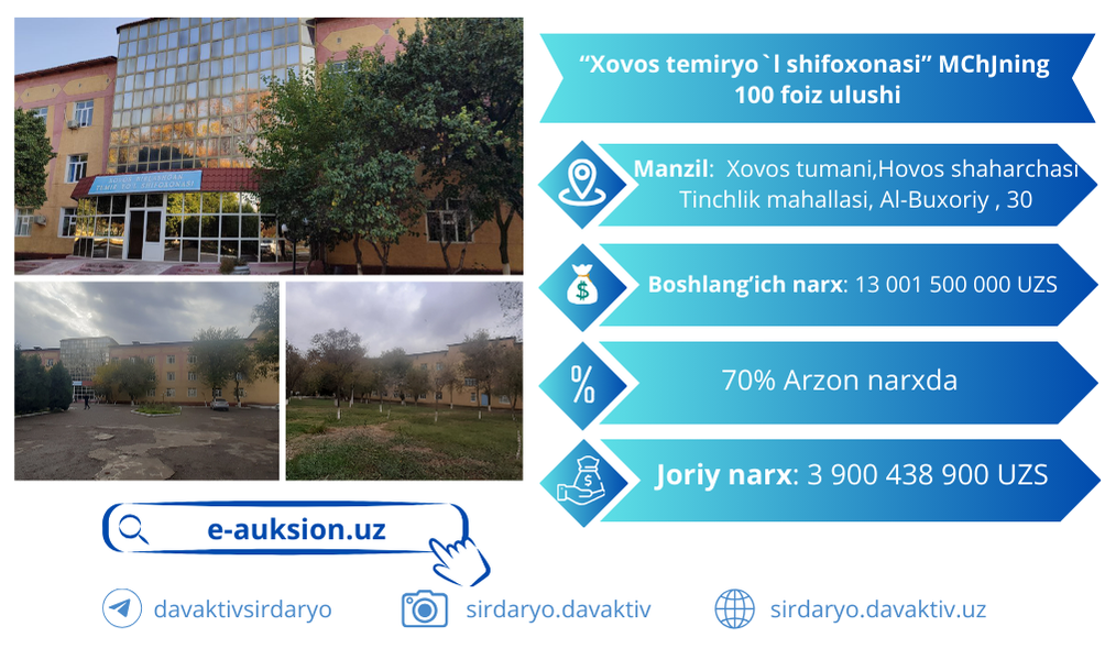 “Xovos temiryo`l shifoxonasi” MChJning 100% ulushini 70% arzon narxda sotib olin…