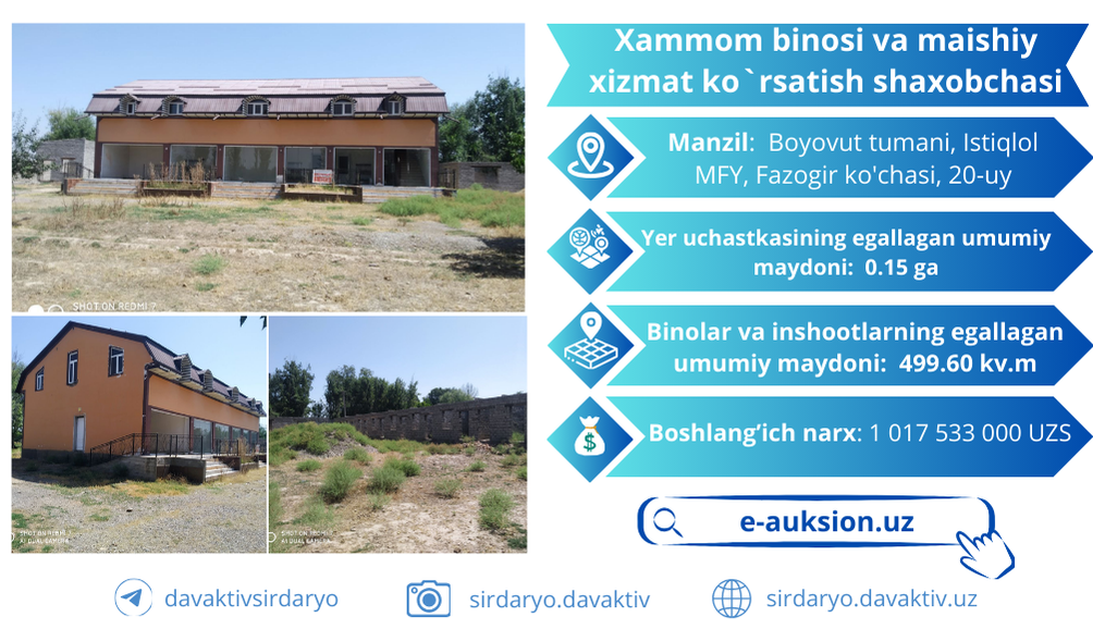 Xammom binosi va maishiy xizmat ko`rsatish shaxobchasini e-auksion da 60 oy mudd…