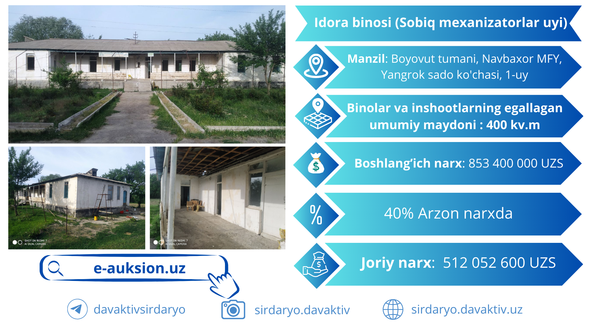 Idora binosi (Sobiq mexanizatorlar uyi) ni e-auksion platformasida 60 oy muddatl…