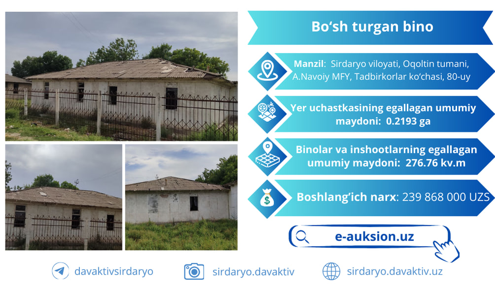 e-auksion platformasida bo'sh turgan binoni 60 oy muddatli to'lovga yanada arzo…