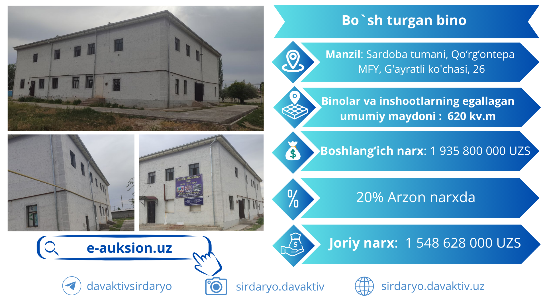 E-auksion da bo'sh turgan binoni 60 oy muddatli to'lovga sotib oling.