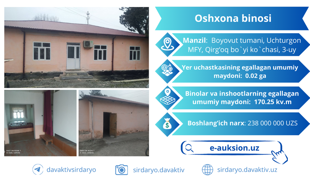Oshxona binosini e-auksion da 60 oy muddatli to'lovga sotib oling.
